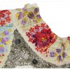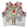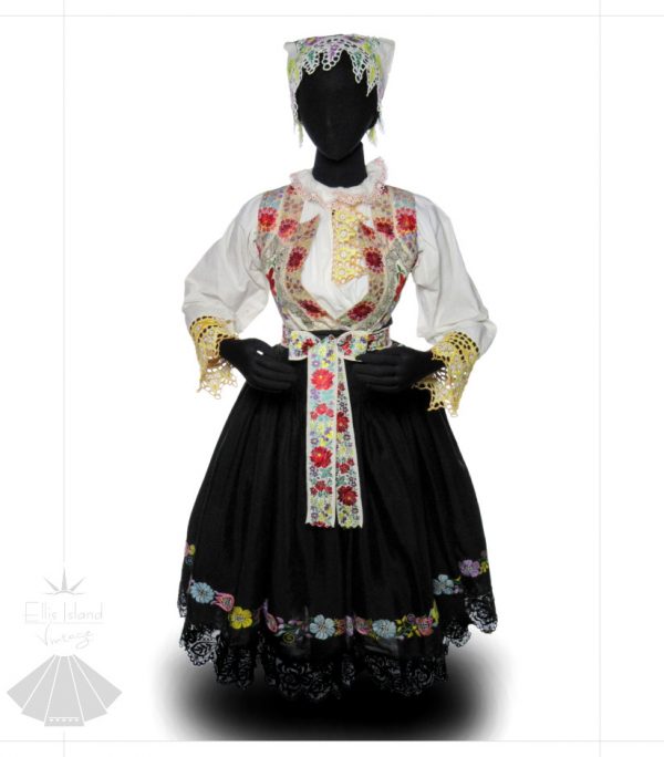 Additional Notes: Traditional woman’s folk costume from the village of Banka in western Slovakia. Multicolored floral embroidery on all of the elements along with openwork embroidery on the blouse and cap. Beautiful metal lace trim on the vest.